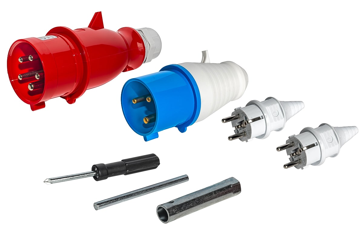 - Розетки: 230В – 16А 1 шт.(европейского стандарта), 1 розетка 230В - 32 А, 380В - 32А 1 шт.(промышленная), что позволяет подключать разные электроинструменты