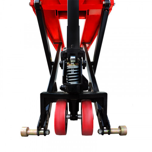 При подъёме вил на высоту 400 мм опускаются дополнительные опоры, которые предотвращают перемещение тележки и повышают её устойчивость. Полиуретановые колёса отличаются высокой износостойкостью, бесшумностью и не оставляют следов на поверхности.