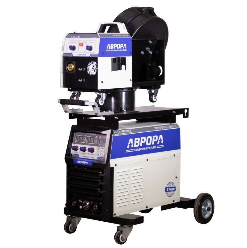 АВРОРА ПРОГРЕСС 350 - 3х фазный инвертор для полуавтоматической сварки в среде инертного/активного защитного газа MIG-MAG и для ручной дуговой сварки штучным электродом MMA. Аппарат выполнен в корпусе "декомпакт" со съёмным подающим механизмом. Рекомендованный тип катушек проволоки D200 и D300 (5-20кг). Мощный подающий механизм предназначен для работы с горелками длиной до 5 метров. Тележка с подставкой под баллон и высокая компоновка аппарата существенно облегчают работу сварщика.