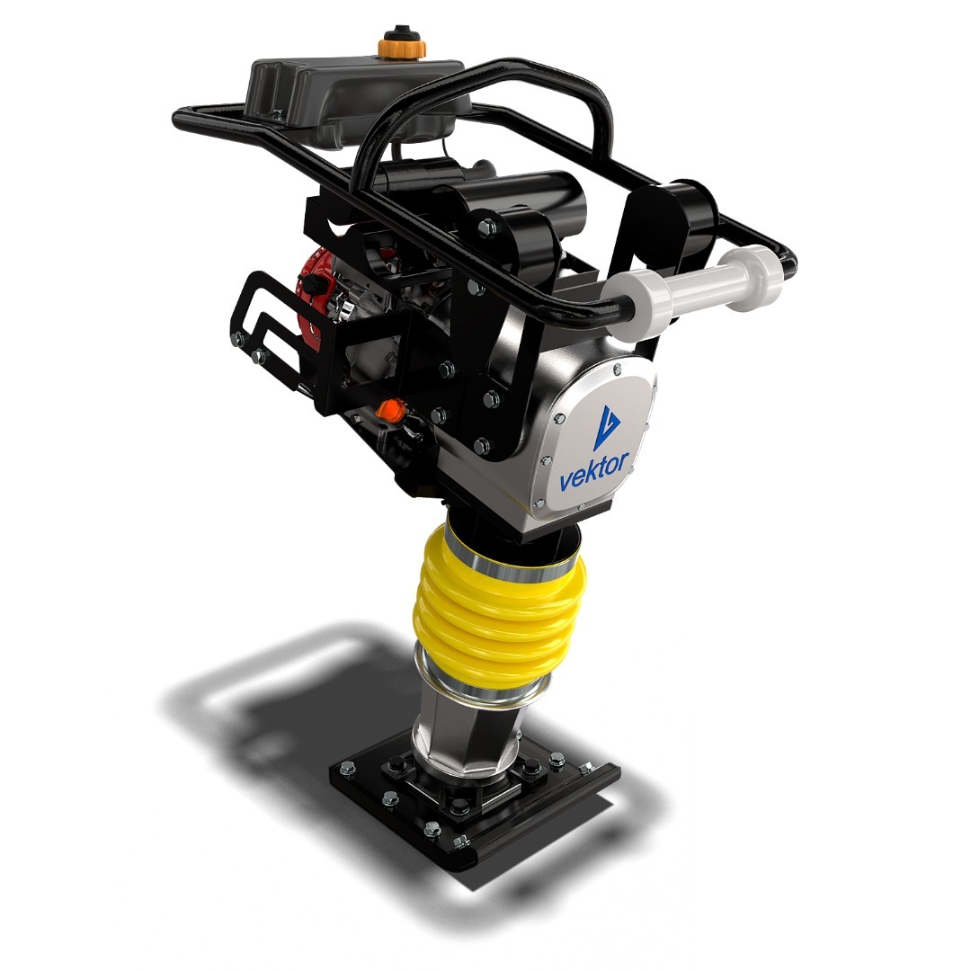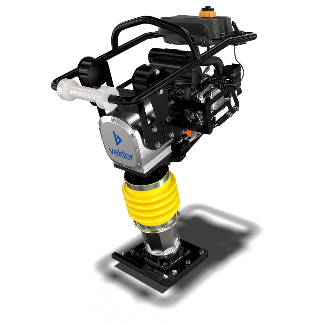 Вибротрамбовка (вибронога) Vektor VRG-80 — это устройство, предназначенное для уплотнения различных видов грунта. Она оснащена ударным механизмом и обладает небольшой уплотняющей поверхностью, выполненной из каучука, размером 330х290 мм.
